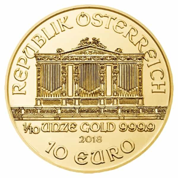 Die Abbildung zeigt als Produktbeispiel die 1/10 Unze Wiener Philharmoniker Goldmünze der Münze Österreich AG aus dem Jahr 2018.
