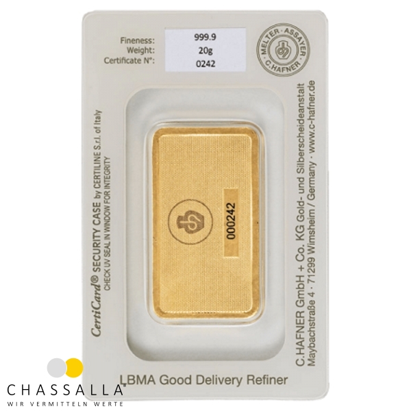 Sie möchten informiert werden, wenn 20 Gramm Goldbarren C.HAFNER unter einem bestimmten Preis erhältlich ist? Dann geben Sie bitte Ihren Wunschpreis an.
