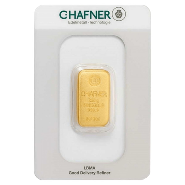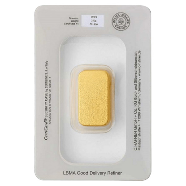 Die Abbildung zeigt den 250 Gramm Goldbarren C.HAFNER als Produktbeispiel.