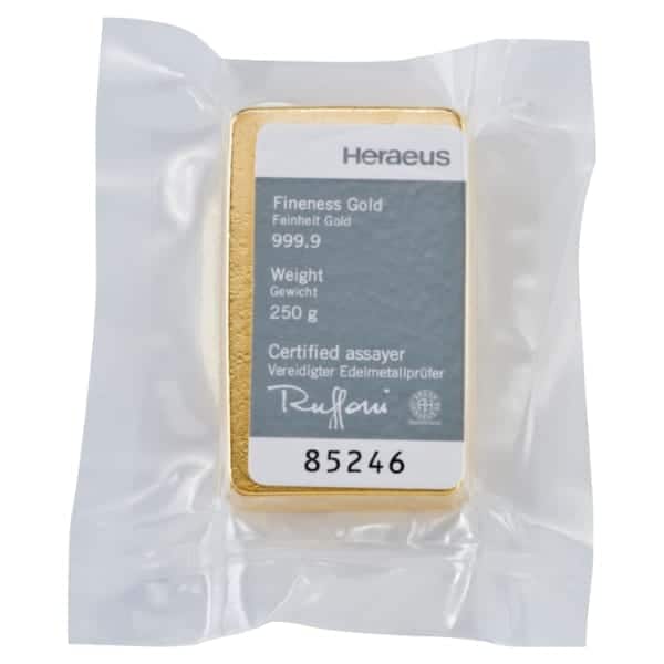 Mit dem Kauf des 250 Gramm Goldbarren der Firma Heraeus erhalten Sie eine sichere und stabile Wertanlage. Die Produkte aus dem Hause Heraeus zeichnen sich durch eine erstklassige Verarbeitung und ein optimales Preis-Leistungs-Verhältnis aus, was sie zu einem der am häufigsten nachgefragten Produkte bei CHASSALLA® Edelmetalle macht.