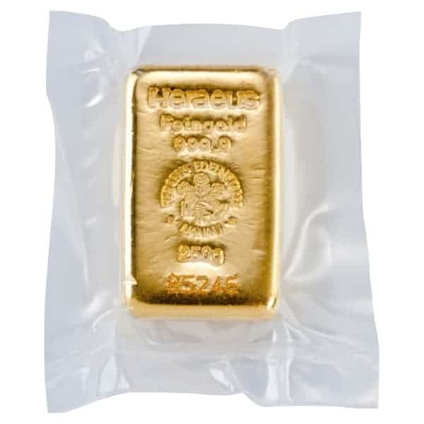 Die Goldbarren bis zu einem Gewicht von 100 Gramm sind als geprägte Barren verfügbar. Zum Schutz sind diese in einer Blisterkarte aus umweltfreundlichen PET-Kunststoff verpackt. Ab einem Gewicht von 250 Gramm sind die Heraeus Goldbarren in gegossener Form erhältlich. Diese kommen zusammen mit dem Qualitätszertifikat in Folie eingeschweißt zur Auslieferung.