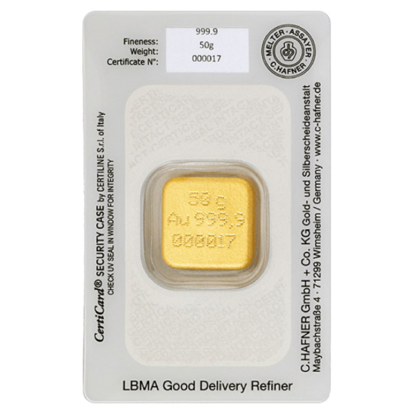 Die Abbildung zeigt den 50 Gramm Goldbarren (gegossen) C.HAFNER als Produktbeispiel.