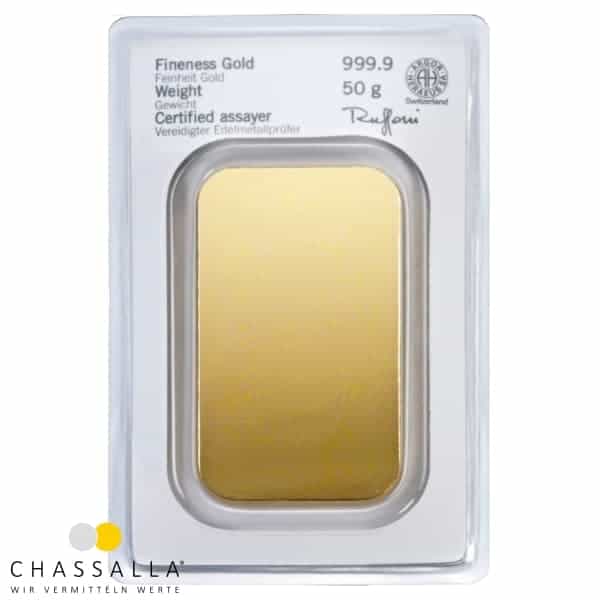Mit dem Kauf des 50 Gramm Goldbarren der Firma Heraeus erhalten Sie eine sichere und stabile Wertanlage. Die Produkte aus dem Hause Heraeus zeichnen sich durch eine erstklassige Verarbeitung und ein optimales Preis-Leistungs-Verhältnis aus, was sie zu einem der am häufigsten nachgefragten Produkte bei CHASSALLA® Edelmetalle macht. Die Abmessungen des 50 Gramm Goldbarren von Heraeus sind 49,7 mm x 28,5 mm x 2 mm.Verfügbare Größen