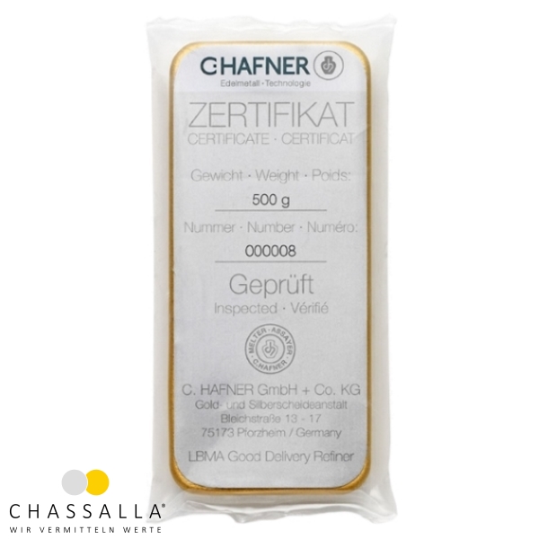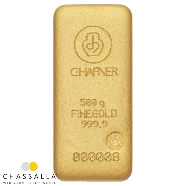 Die Abbildung zeigt den 500 Gramm Goldbarren C.HAFNER als Produktbeispiel.